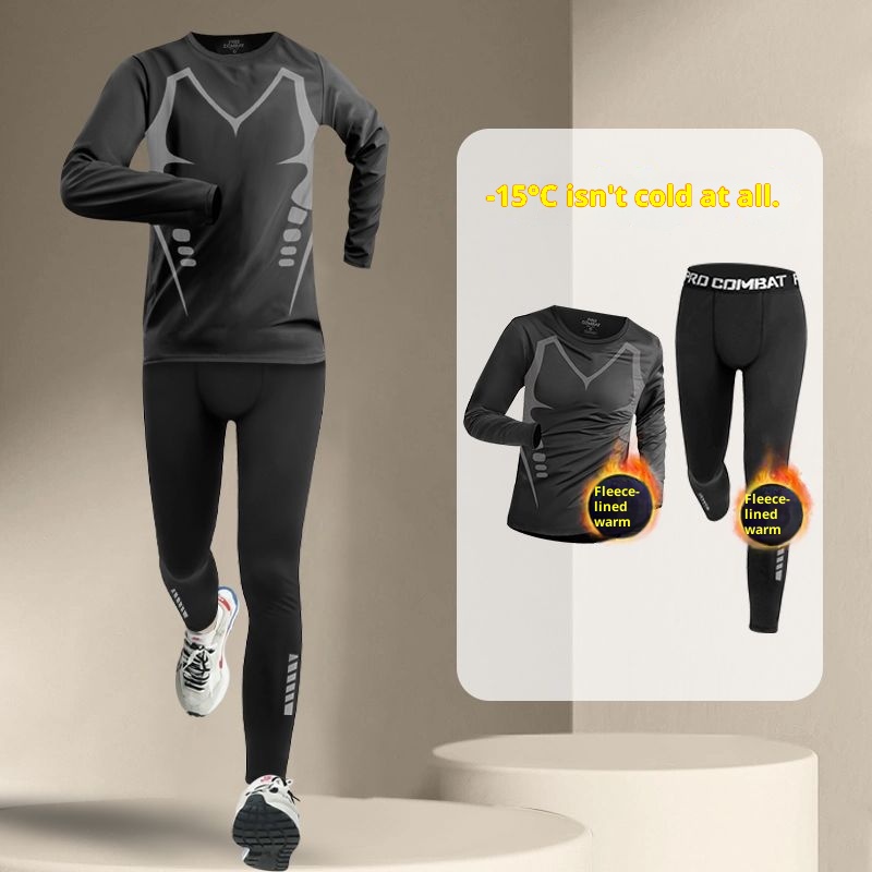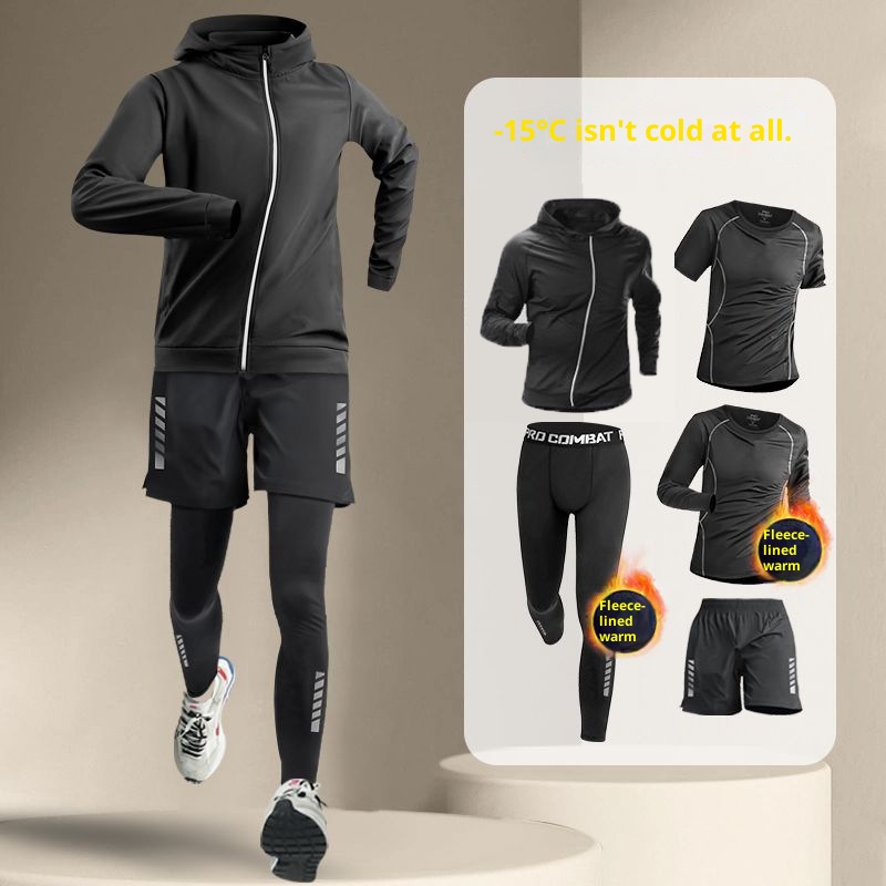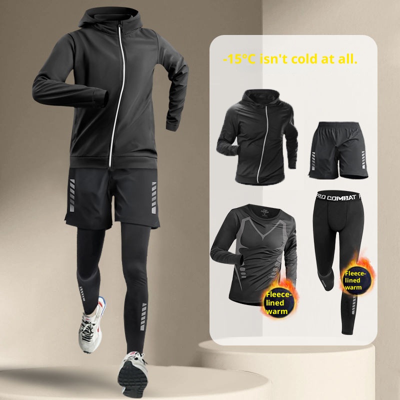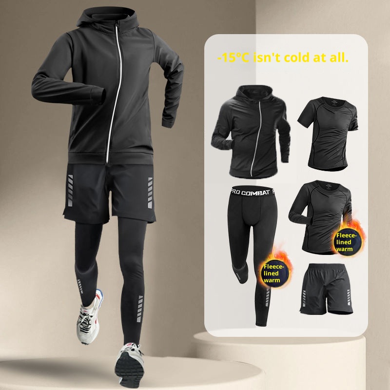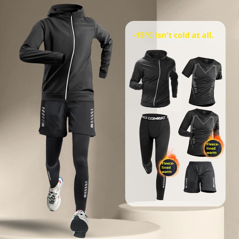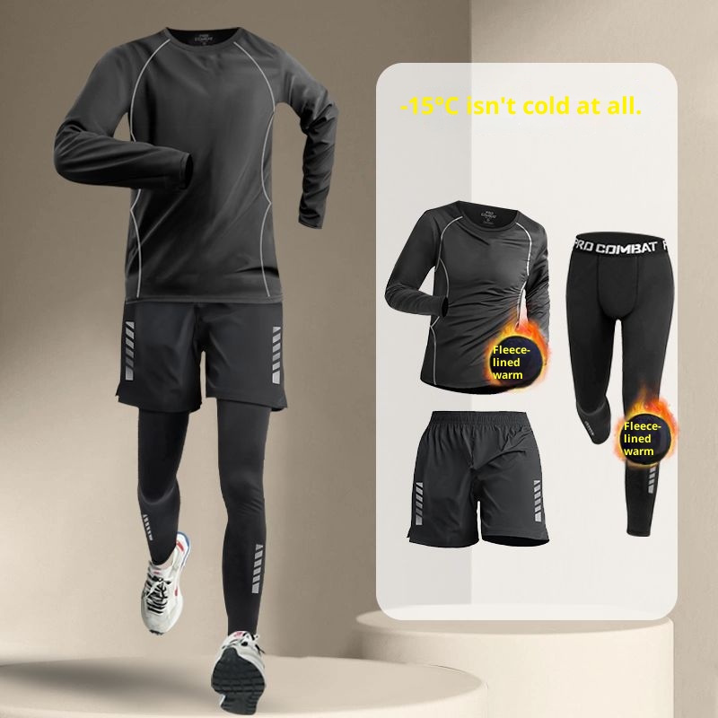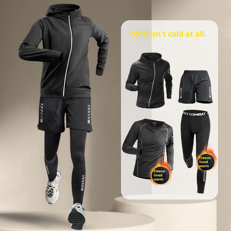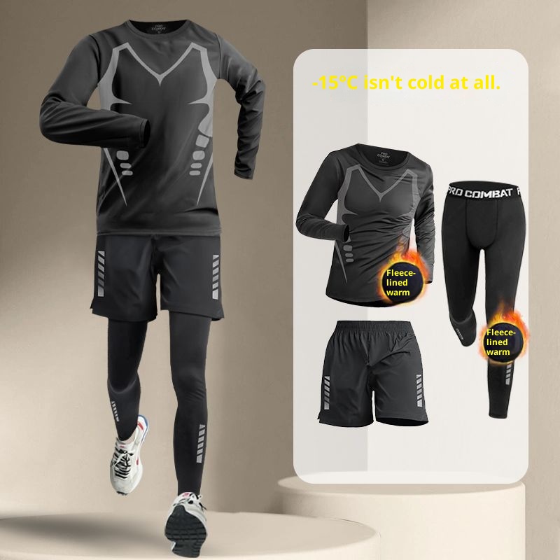 001 Completo da corsa invernale da uomo, foderato in pile, caldo, abbigliamento fitness, casual, versatile, ad asciugatura rapida, allenamento sportivo mattutino