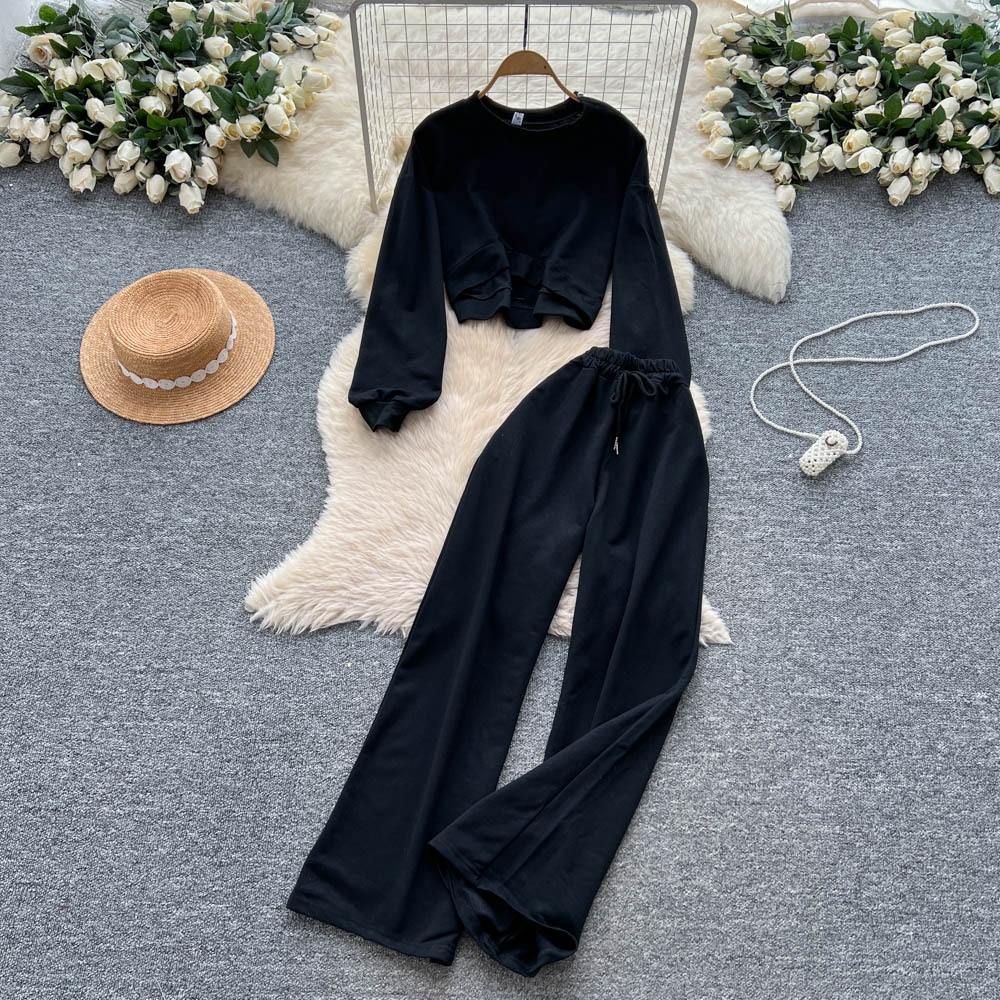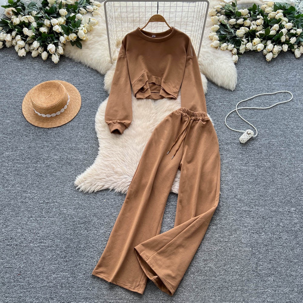 001 Tuta sportiva casual da donna, felpa autunnale a maniche lunghe con scollo rotondo e corto, pantaloni larghi a vita alta e snellenti