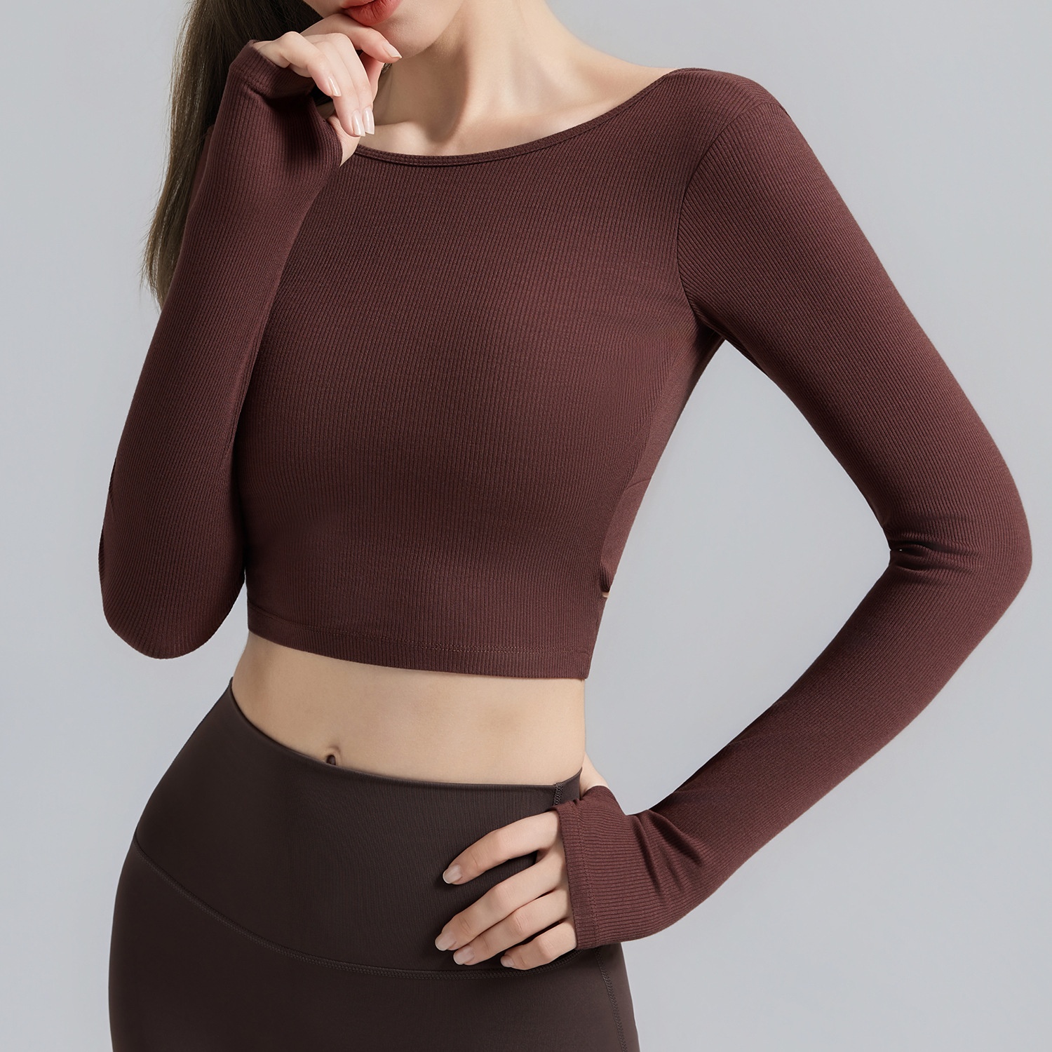 001 Top da yoga da donna con imbottitura per il petto, per pilates, con schiena scoperta, dimagrante, sportivo, a maniche lunghe, per allenamento e fitness