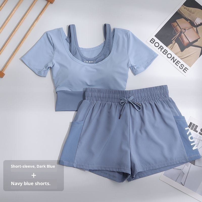 001 Pantaloncini sportivi da yoga a maniche corte con imbottitura sul petto, set da corsa traspirante per donna, estate, sottile