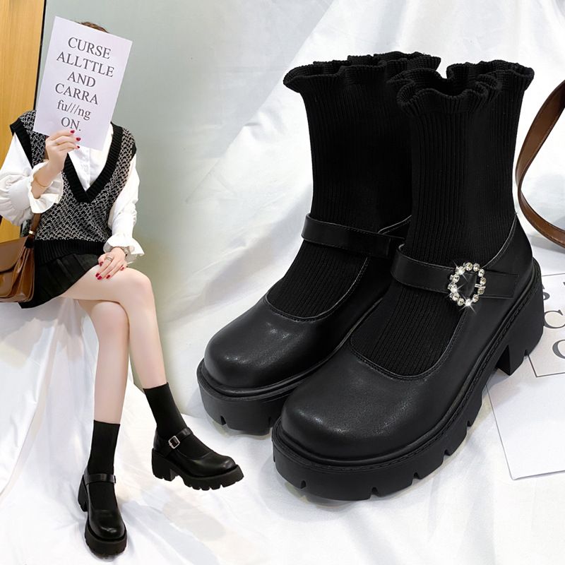 2021 Nuove scarpe Mary Jane in pelle con punta tonda per donna, suola spessa, elasticizzato, in maglia, stivali corti primaverili e autunnali