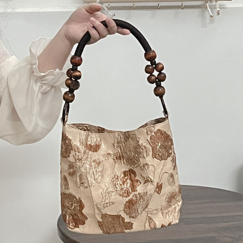 2023 Summer Brown Jacquard Underarm Bag Instagram New Chinese Wooden Bead Weaving Chain Single Shoulder Bucket Bag for Women