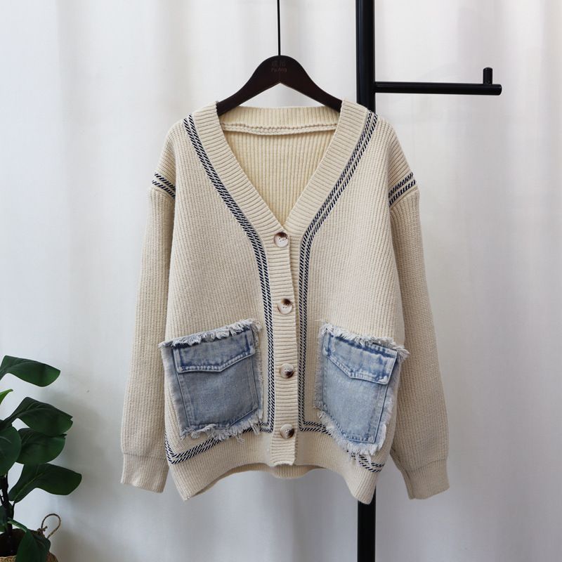 2024 Autumn Winter New Patchwork Denim Pocket Sweater Coat High-end European Style Loose Versatile Knitted Cardigan for Women