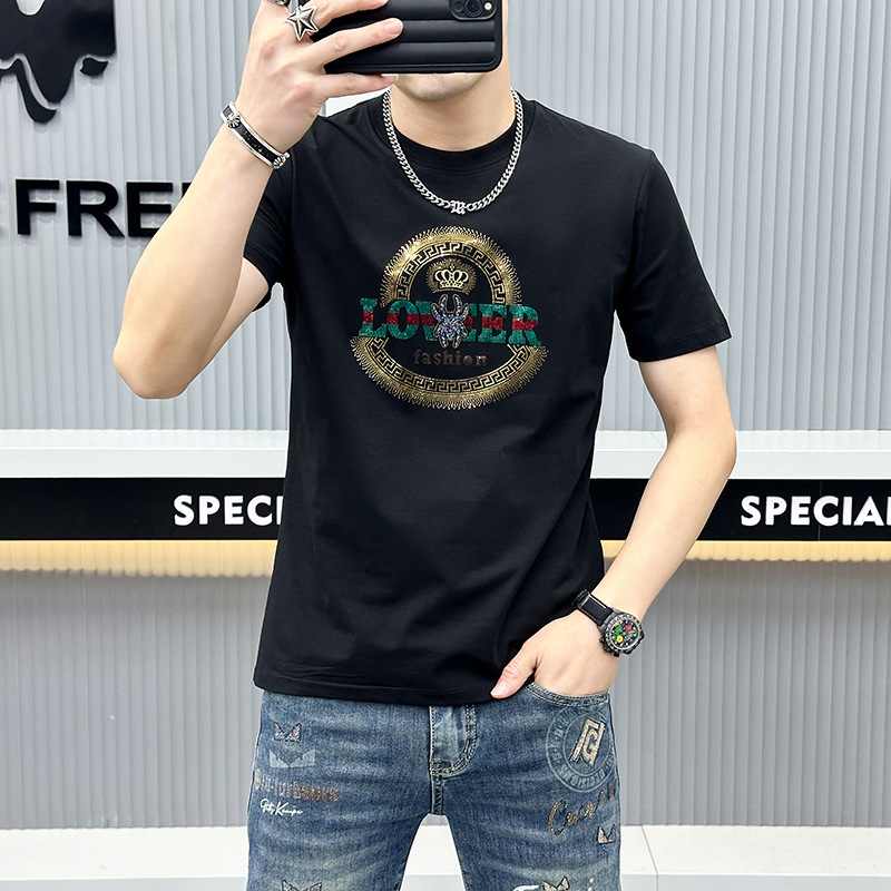 2024 Fashion Luxury Round Neck Short sleeved T-shirt for Men's High end Letter Hot Diamond Printed Breathable Slim Fit Fashion Brand Short sleeved Shirt