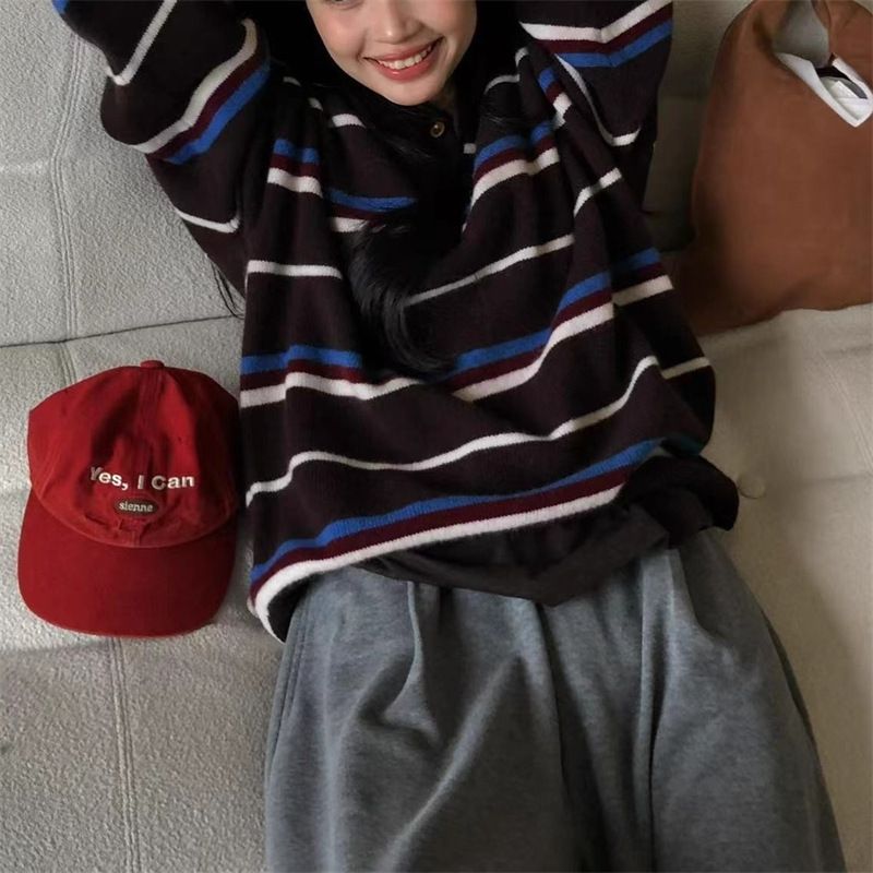 2025 Autunno Inverno Nuovo Stile College Coreano Semplice Colletto Polo Lavorato a Maglia a Righe per Le Donne Largo Dimagrante Anti-Età