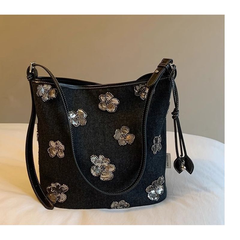 2025 Hot-Selling Starlight Dreamland Tote Bag Black Denim Shoulder Bag for Women with Glitter Flowers Crossbody