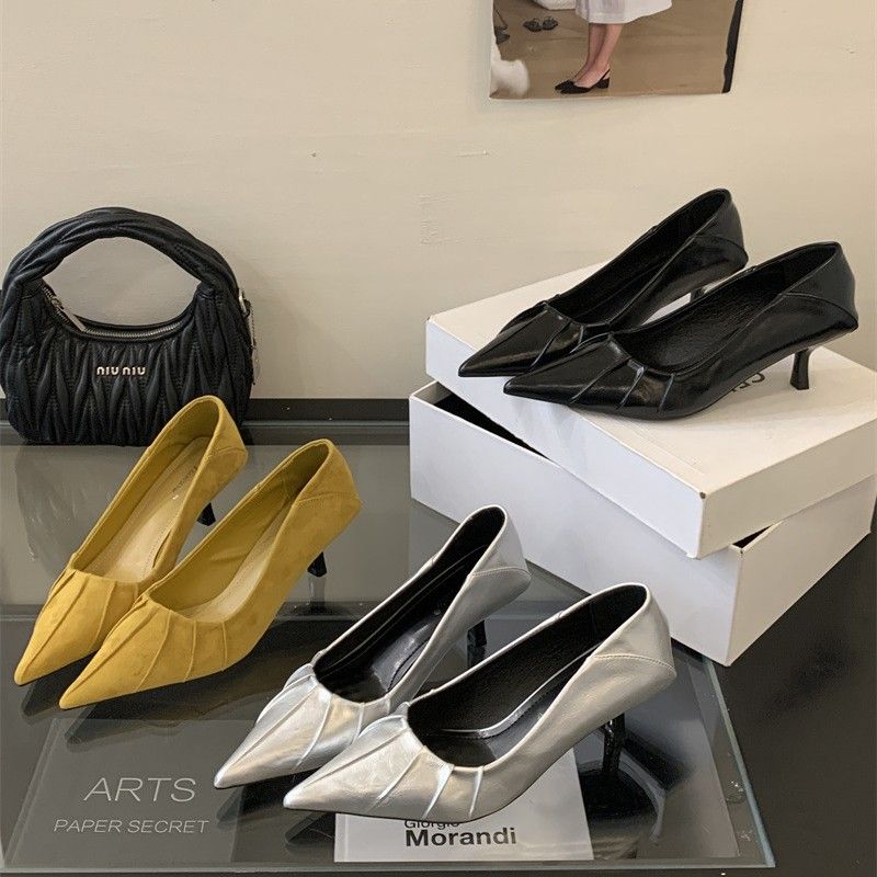 2025 New Pointed Pleated High Heels for Women French Style Professional Soft Surface Small Heels Versatile Low Heel Cat Heel Single Shoes