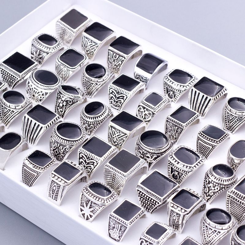 2025 Nuovi arrivi Lotti all'ingrosso 20 pezzi Design Mix Anelli in pietra smaltata nera per uomo Anello da uomo vintage Retro Punk Lega Gioielli regalo per feste