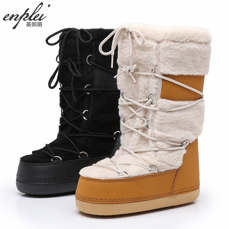 2025 New Thickened Ski Space Boots with Lamb Wool Fur Patchwork High Tube Snow Boots