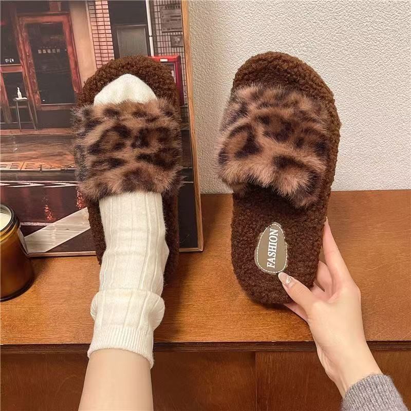2025 New Furry Slippers with Fleece Lining, Warm for Autumn and Winter, Home Flat Non-Slip Korean Style Leopard Print Plush Cotton Slippers for Women