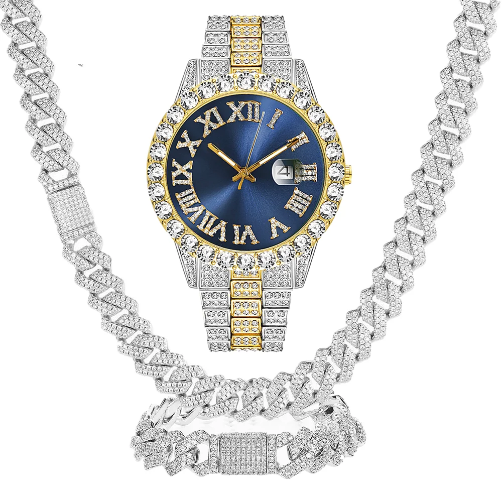 3PCS Men's and Women's Same Hip Hop Calendar Watch Necklace Bracelet Jewelry Set Bling Bling Gold Sier Diamond Cuban Chain