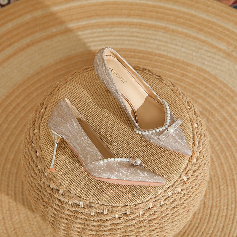 811-3 Scarpe da damigella d'onore con fiocco di perle in stile fata, 2025, nuove scarpe con tacco a spillo a punta per le donne