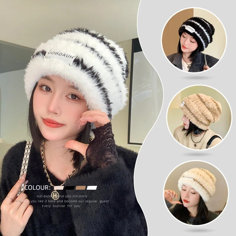 8312 Hat Women's Winter Stripe Plush Knitted Wool Hat Warm Ear Protection Cover Cap Fashion Versatile Stacked Hat