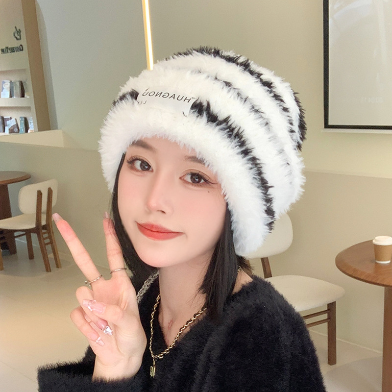 8312 Hat Women's Winter Stripe Plush Knitted Wool Hat Warm Ear Protection Cover Cap Fashion Versatile Stacked Hat