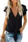 Abbigliamento da donna, camicia estiva in chiffon con bottoni e annodamenti, scollo a V, top da donna con volant e maniche corte