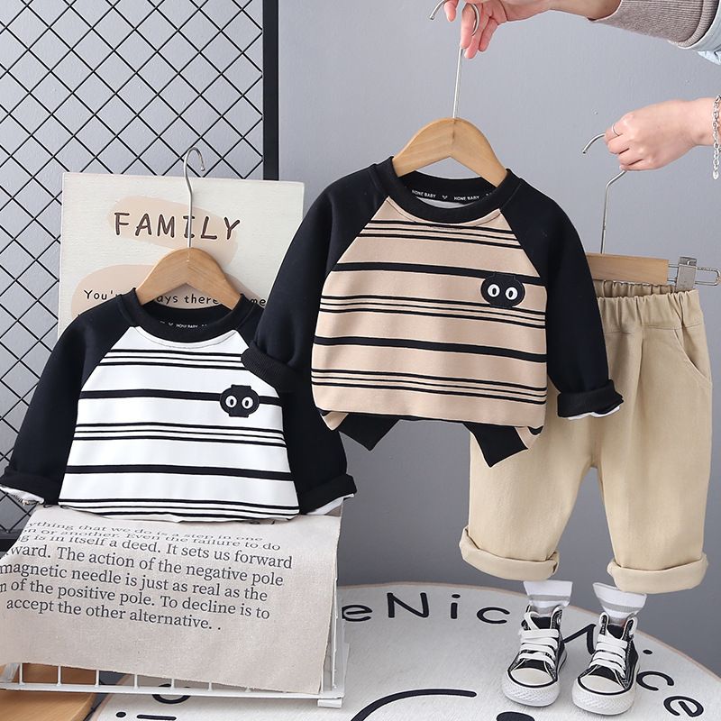 Boys' Set Spring and Autumn Fashionable Autumn Clothing Children's Autumn Striped Shoulder Hoodie Two Piece Set Baby Clothes