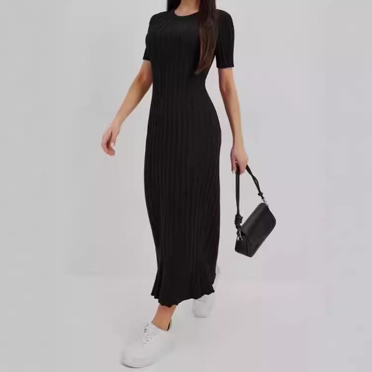 2025 Autumn Winter New Dress Waist-Cinching Round Neck Large Ribbed Slimming Knitted Short Sleeve Dress