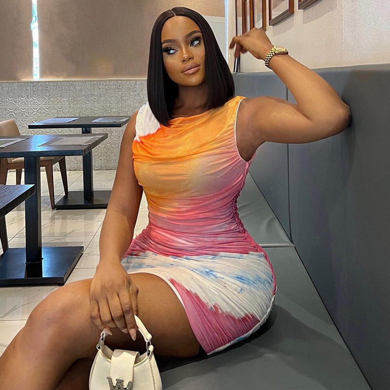 Abito casual alla moda da donna, aderente, in patchwork di rete, senza maniche, con scollo rotondo e stampa, in stile Ins