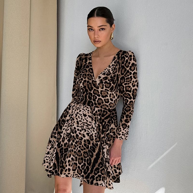 Abito corto a trapezio con scollo a V e maniche lunghe, con stampa leopardata, da donna, autunno 2025, nuovo stile