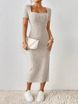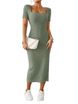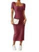 2025 hip, waist, square collar, side slit ribbed knitted short sleeved dress for women