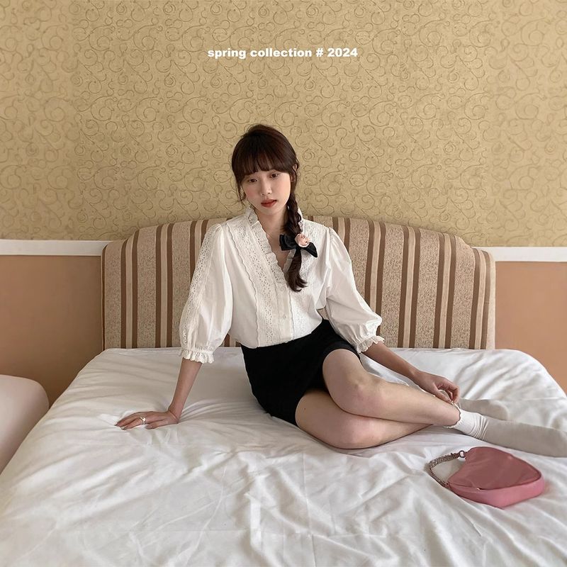 【Nanfa White Moonlight】Geming French V-neck Lace Blouse 2025 Summer Commuter Top Y1312F