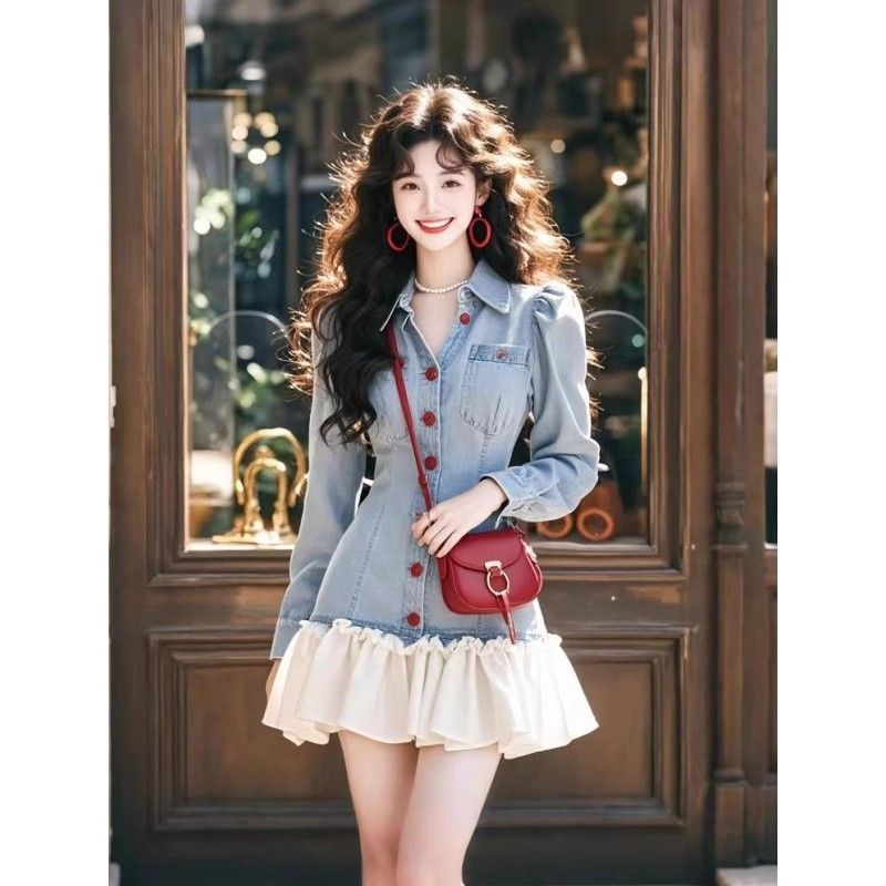 Design sense splicing denim dress for women in the spring of 2025, slim fit and waist cinching short skirt