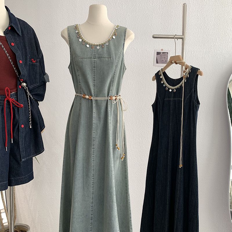 Abito in denim di media lunghezza con scollo rotondo, nappe, senza maniche, stile Omalei, estivo, da donna, 3086