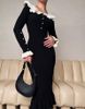 Abito in maglia di ispirazione francese con scollo a balze – Abito midi in rayon a vita alta da donna per autunno e inverno (S-XL, manica lunga con bottoni,