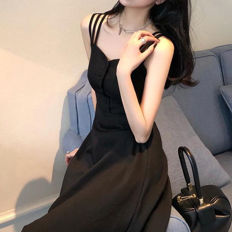 Strappy Dress for Women Summer 2025 New Little Black Dress French Tea Break Platycodon Knee-Length Waist-Cinching Long Dress