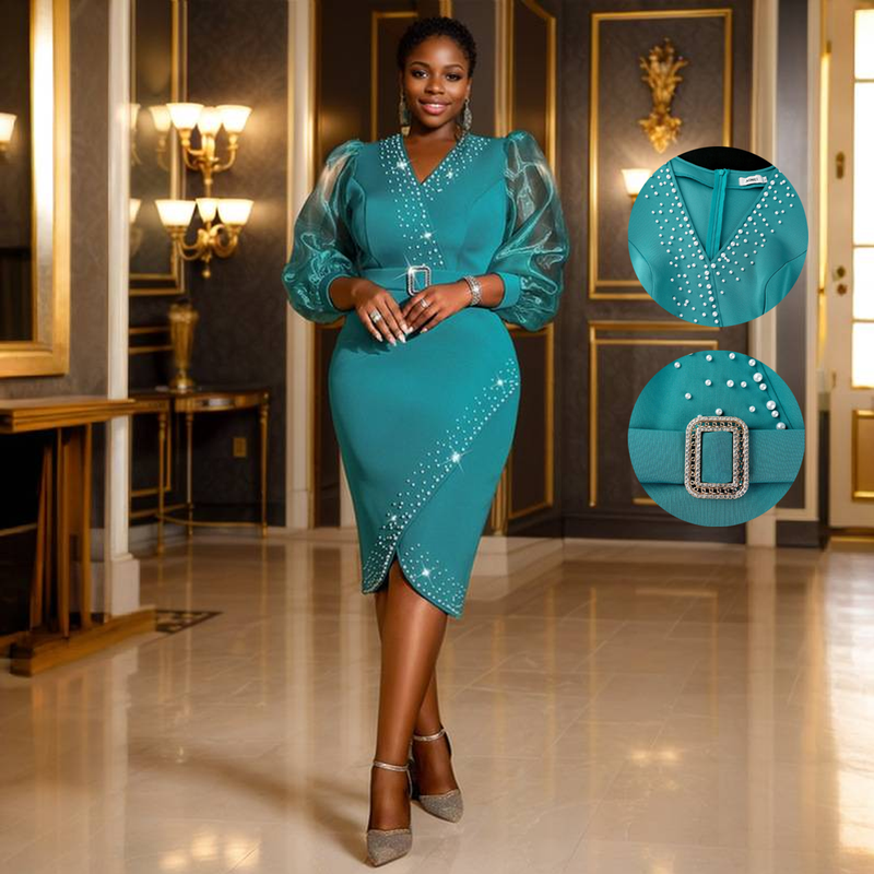 Abito lungo con scollo a V elastico e maniche a sbuffo a diamante da donna