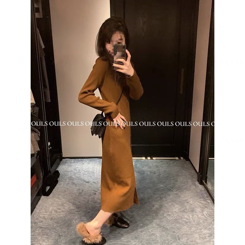 Buttoned Knitted Dress Autumn New Slim Fit Slimming Autumn Winter Two-Way Wear Sweater Knitted Dress Long Dress