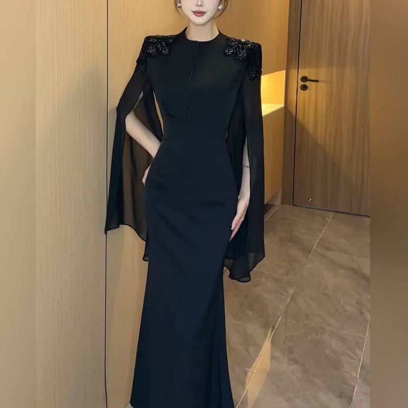 Socialite Elegant Fashion High-End Waist-Slimming Long Dress Spring New Black Versatile Cape Dress