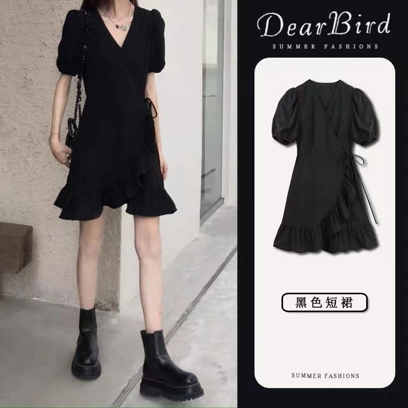 Black One-Piece Dress with Ruffled Hem, Summer 2025 Waist-Tightening Tie Slimming Little Black Dress