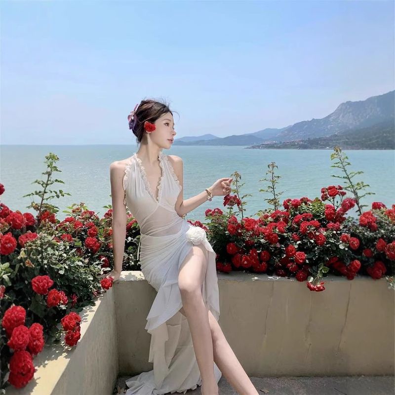 Abito senza maniche con scollo all'americana per donna, design sensato, volant, snellente, orlo irregolare, per un appuntamento romantico