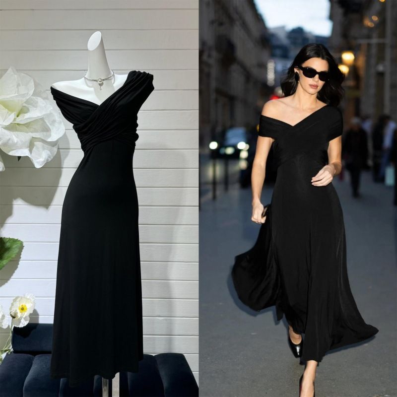 2024 Summer New Cross Pleated Off-Shoulder Dress French Waist A-Line Flared Dress