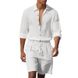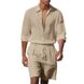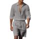 Adatto a tutte le stagioni, completo estivo in lino, due pezzi, stile americano, semplice, da spiaggia, con camicia a maniche lunghe e pantaloncini da uomo.