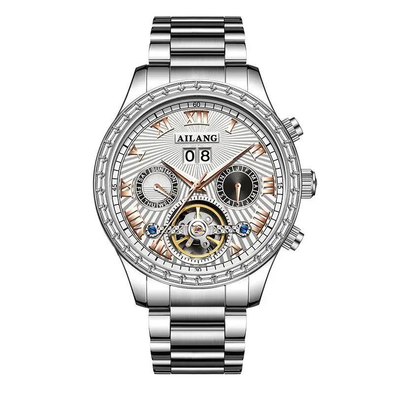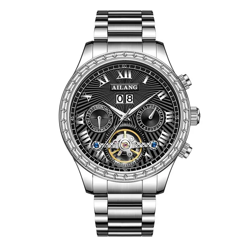AILANG Orologio da polso di lusso Tourbillon luminoso impermeabile con data Orologio da uomo in acciaio inossidabile Orologi meccanici automatici da uomo Reloj