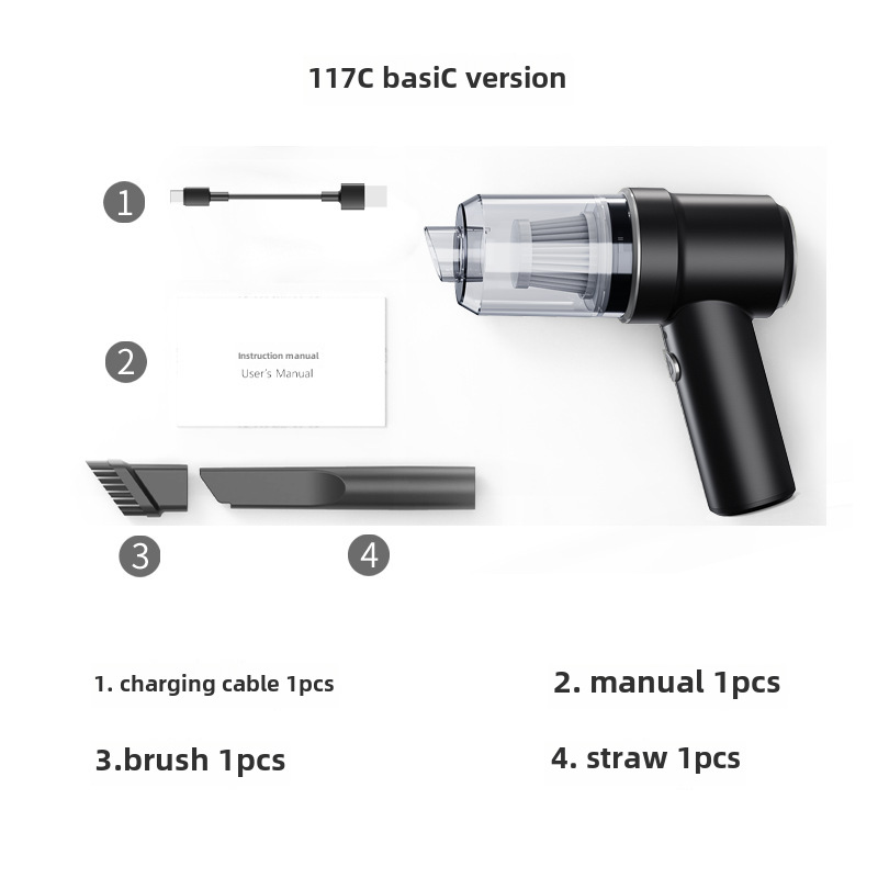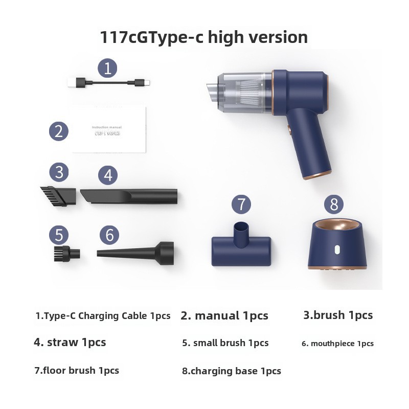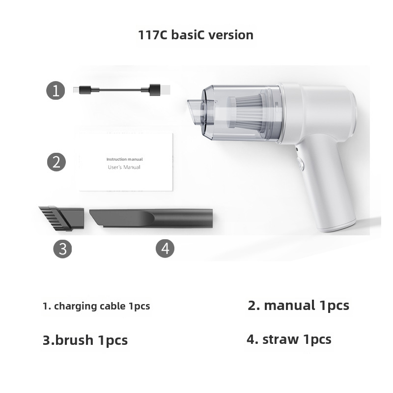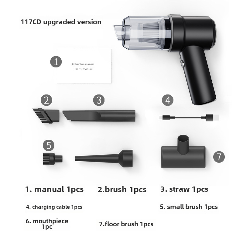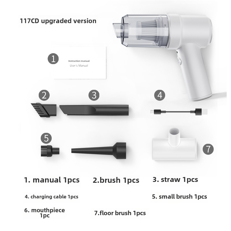 Dual Power Supply:This car vacuum cleaner features a dual power supply, allowing for continuous operation without the need for frequent recharging. Versatile Use:Designed for both car and home use, this compact handheld device is perfect for removing dust and debris from your vehicle or living space. High Suction Power:With a vacuum suction power of 4500PA, this device ensures efficient cleaning, picking up even the smallest particles and dirt. Multiple Color Options:Available in a variety of colors including white, black, and blue, you can choose the one that best suits your style or matches your existing appliances. Upgraded Models:The product offers two upgraded models, 117CD and 117CG, providing enhanced features and performance for your cleaning needs. One-Unit Design:The one-unit design of this vacuum cleaner means it's easy to handle and maneuver, making your cleaning tasks less demanding.
