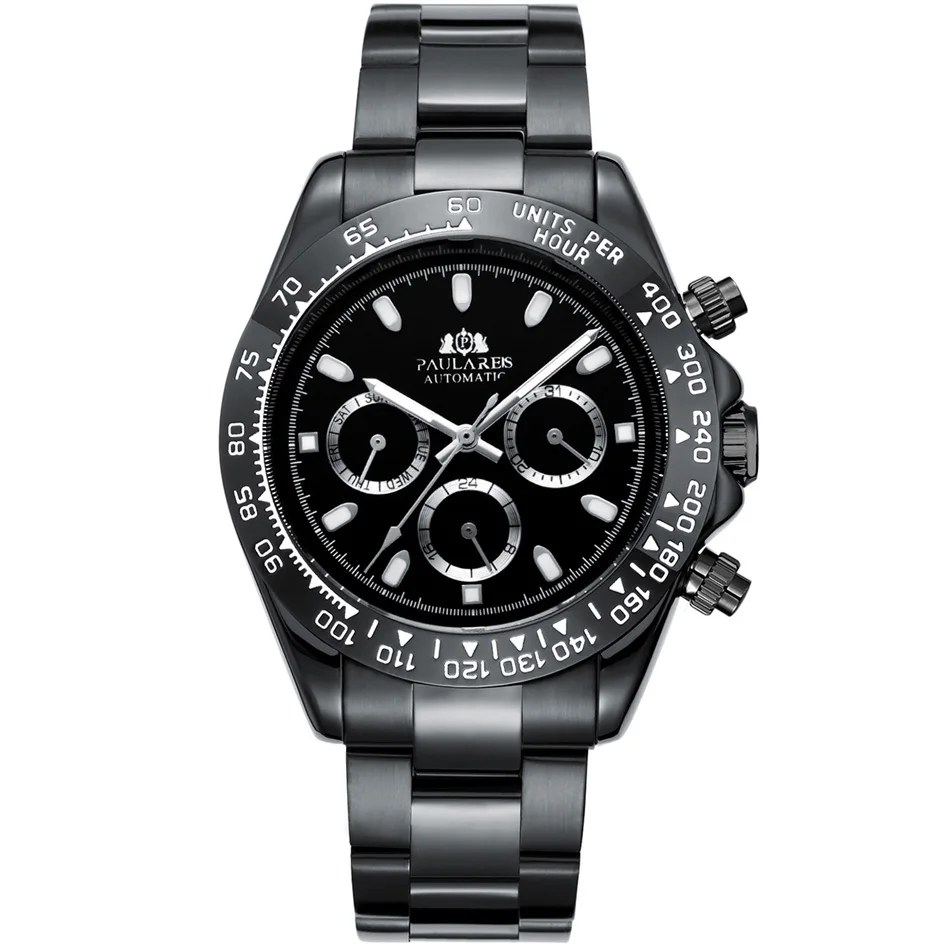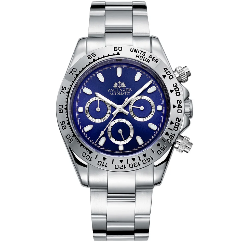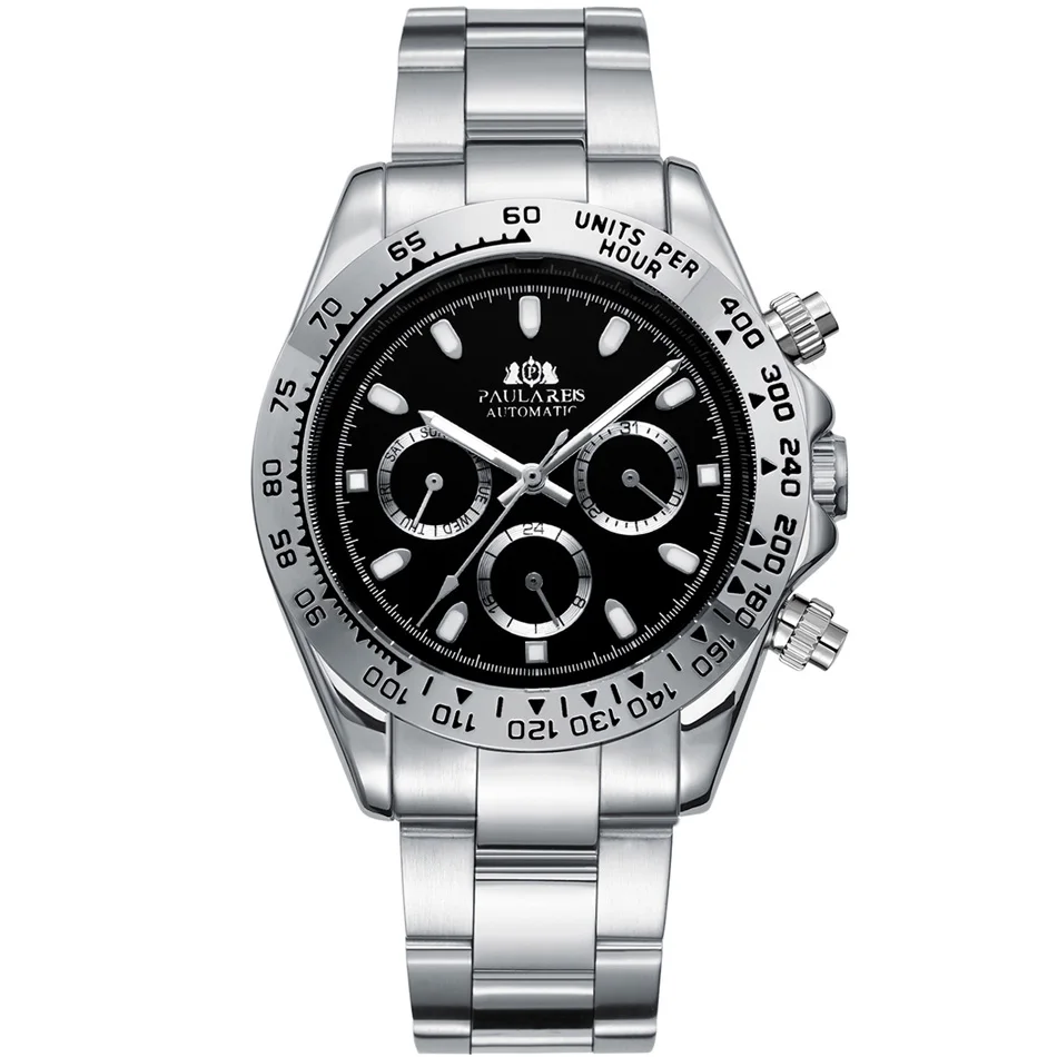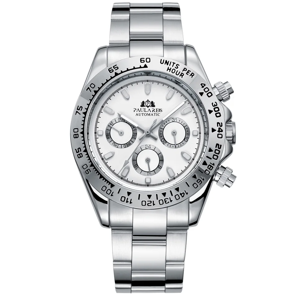 Case Shape:RoundDial Window Material Type:HardlexBoxes & Cases Material:No packageDial Diameter:40mmCase Thickness:15mmBand Length:22cmBand Width:20mmBand Material Type:Stainless SteelModel Number:Daytona StyleFeature:Complete Calendar,Week Display,luminous handsStyle:SPORTWater Resistance Depth:3BarClasp Type:Folding Clasp with SafetyCase Material:AlloyMovement:Automatic Self-WindBrand Name:PAULAREIS POrigin:Mainland China