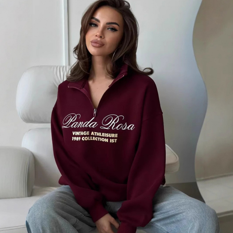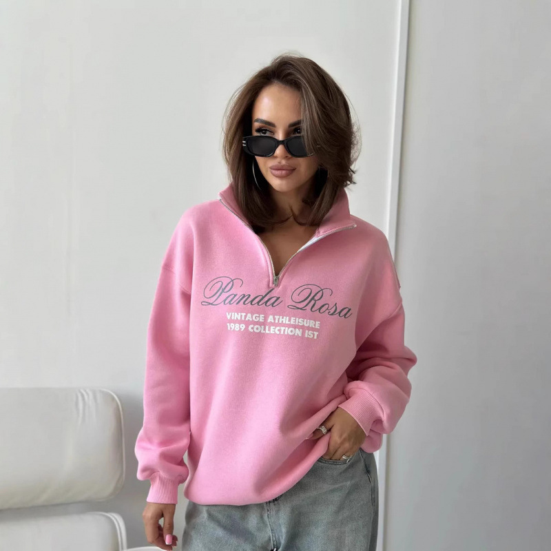 Autumn Winter Fleece Lined Thick Loose Warm Turn-Down Collar Half-Zip Sweatshirt Versatile Design Printed Top