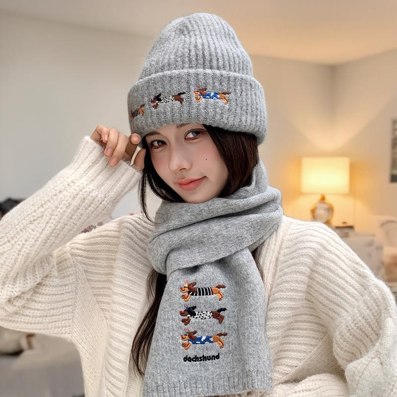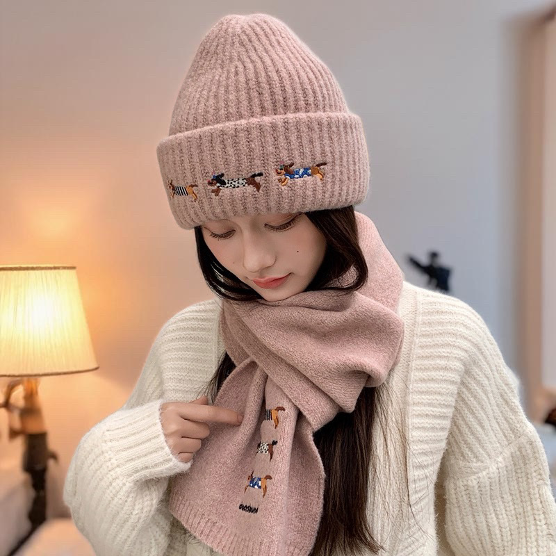2025 Autumn/Winter New Arrivals Cute Dog Embroidered Scarf Set Winter Warm Couples Knitted Hat Sweater Wool Hat
