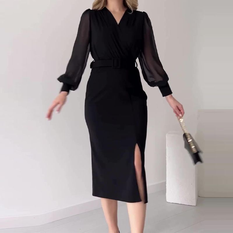 Autunno 2024 nuovo abito da donna con gonna divisa europea e americana con maniche a lanterna transfrontaliera con cuciture a rete