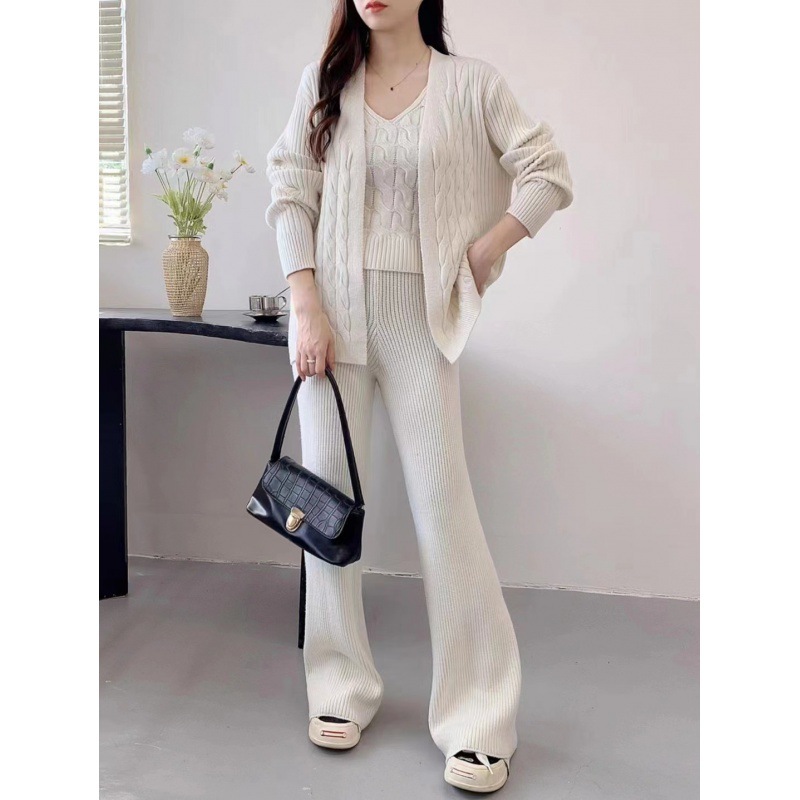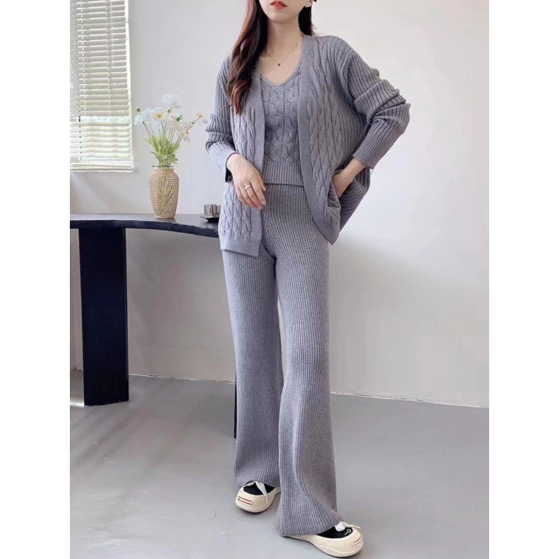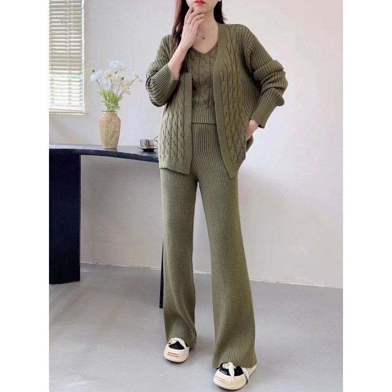 Autumn/Winter Lazy Knitted Set Women's Loose Cardigan Strap Bottom Shirt Extended Wide Leg Pants 3-Piece Set