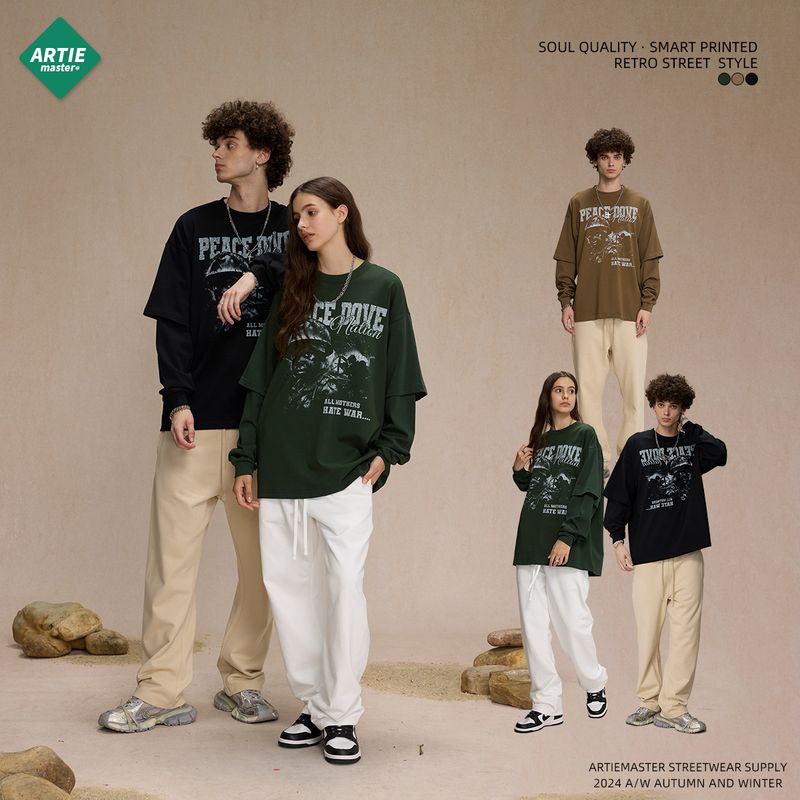 autunno oversize 2024 stampa 305g T-shirt a maniche unite pseudo due pezzi per la moda di strada girocollo americano da uomo