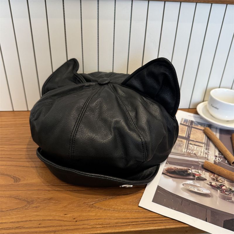 Cat Ear PU Leather Women's Beret, 2025 Fall/Winter New Octagonal Hat