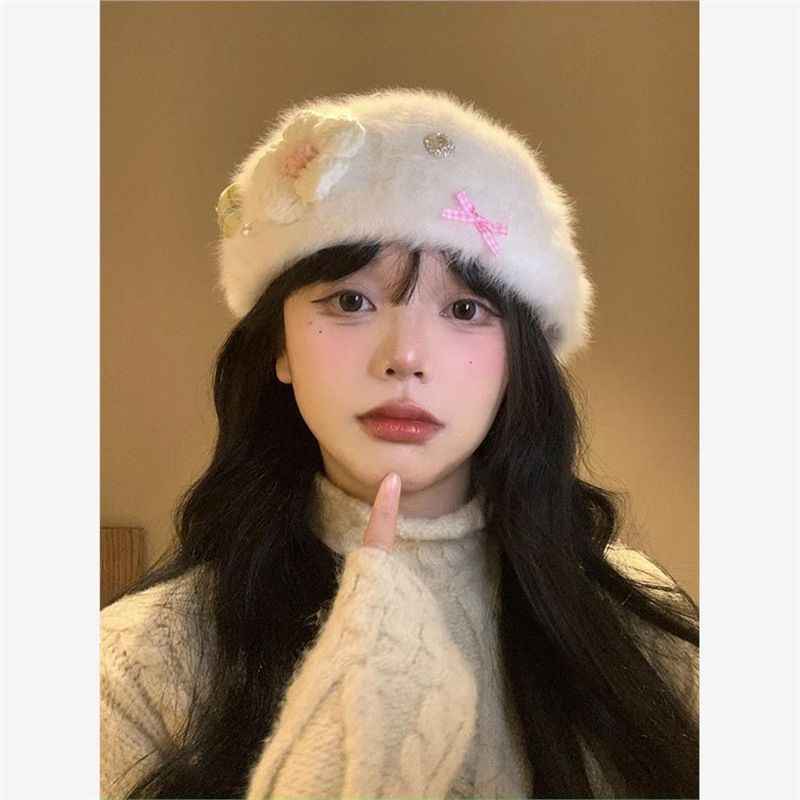 Flower Plush Beret for Women, Autumn and Winter, Large Head Circumference, Face Slimming, Reversible Forward Hat, Warm White Rabbit Fur Hat