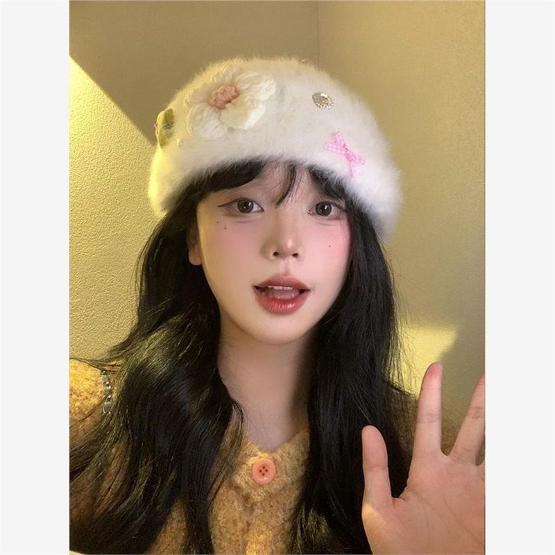 Flower Plush Beret for Women, Autumn and Winter, Large Head Circumference, Face Slimming, Reversible Forward Hat, Warm White Rabbit Fur Hat