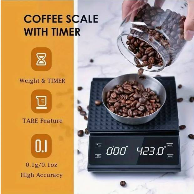 Bilancia digitale per caffè da 6,61 libbre con timer, precisione 0,1 g, leggera, alimentata a batteria, per uso asciutto e bagnato, adatta per filtro, espresso, pressa francese, uso in cucina - Plastica nera, stile resort minimalista casual