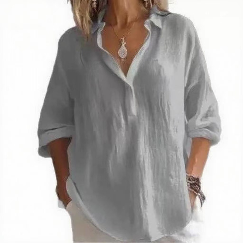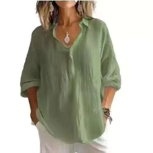 Blusa traspirante in cotone e lino con scollo a V - Top tunica a maniche lunghe dalla vestibilità comoda per donna, colori tenui e tinta unita
