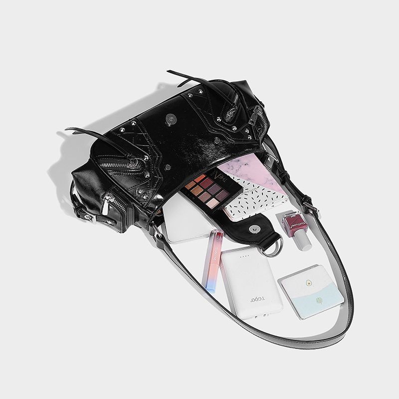 Biker Style Handbag Fashion Niche Rivet Shoulder Bag Multi-Pocket Design Oil Wax Leather Crossbody Bag